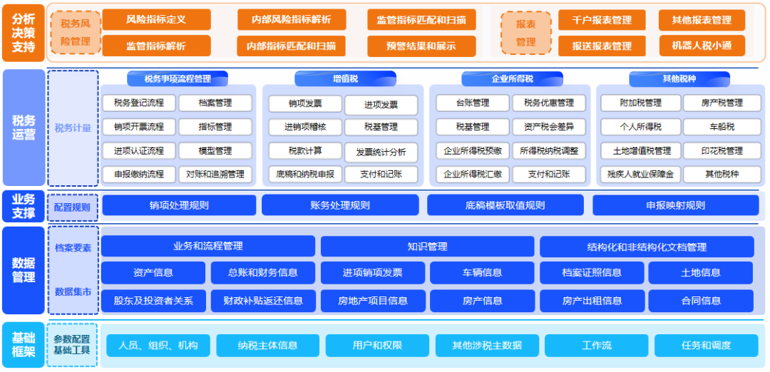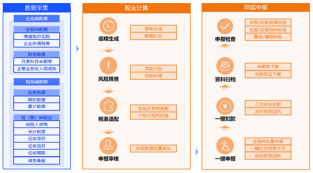 实现税基管理、税金计提、税金申报、税款划拨、完税凭证获取的全税种、全流程线上自动化管理;