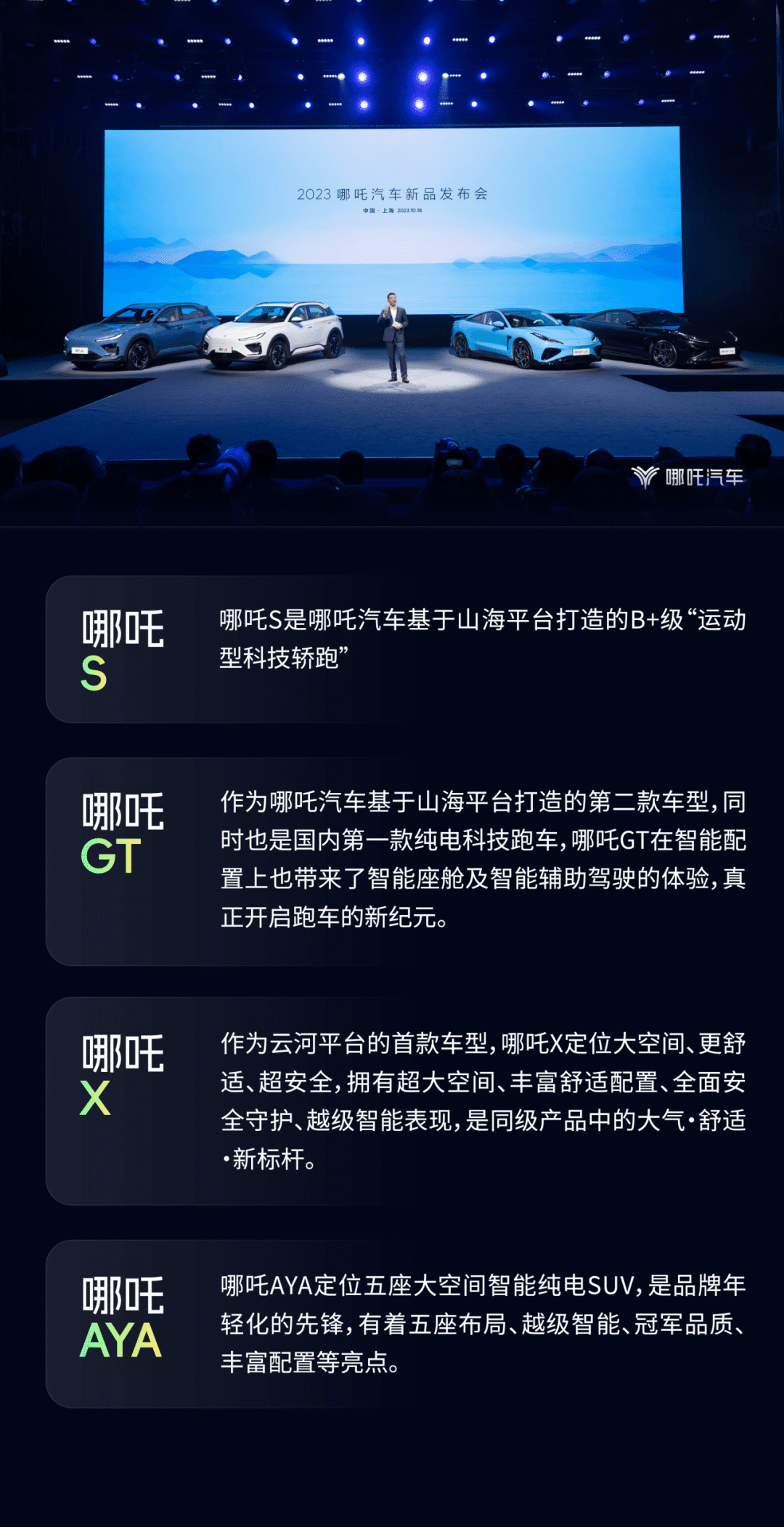 哪吒汽车聚焦大众消费市场,将基于精心打造的全新纯电动汽车专属平台,以每年一款新车的速度,推出多款不同级别的车型,覆盖A0-B级主流市场。现在,哪吒汽车已推出哪吒GT、哪吒S、哪吒U-Ⅱ、哪吒AYA、哪吒V等车型;哪吒汽车已发布全栈自研的智能安全汽车平台——“山海平台”、浩智技术品牌,以满足用户及市场的新需求,更好落地“科技平权”。