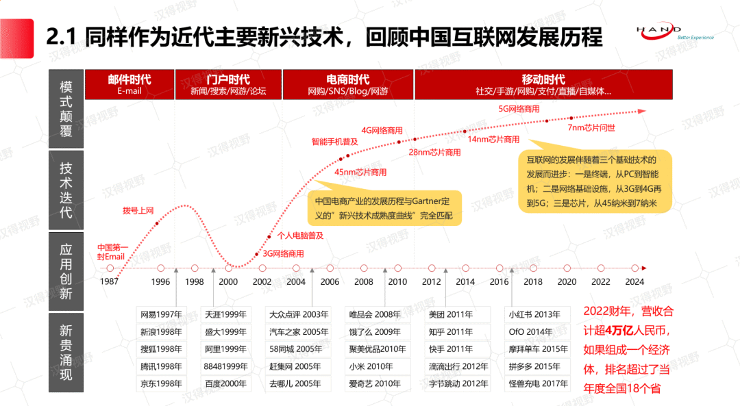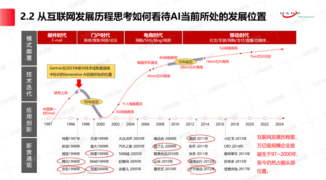 本期我们将聚焦前两问为您分享万象城AWC观点后续还将以分期连载的形式与大家针对其他四问展开探讨喔问题一“AI从什么时候开始出现的,现在到底开展到什么程度了,是否能有个大致的介绍?”1950年,著名的图灵测试诞生,按照“人工智能之父”艾伦·图灵的定义:如果一台机器能够与人类展开对话(顺利获得电传设备)而不能被辨别出其机器身份,那么称这台机器具有智能。同一年,图灵还预言会创造出具有真正智能的机器的可能性。AI从问世到今天,已经过去70余年,这70余年间,AI经历了好几次开展的高峰与低谷:▲ AI的开展伴随着算力、算法和数据的迭代而来如上图所示,AI第一阶段的开展,是在20世纪50到60年代,人工智能刚刚诞生,由于基于抽象数学推理的可编程数字计算机的出现,有助于了人工智能的快速开展,但是随着AI计算任务复杂度不断提高,基于模型的计算受到计算机性能瓶颈的限制,使得AI的开展步入困境。到了20世纪80年代到90年代末,集成电路的突破使得计算机性能大幅提升,同时随着互联网的出现,数据开始在线上被连接,数学模型在这一阶段有了长足的进步,有助于了AI的开展又一次掀起高潮。但这一阶段互联网刚刚起步,数据大范围连接尚未实现,使得AI获取的数据或知识样本数量有限,无法建立起理想的模型推理能力,AI再一次让人类失去了耐心。当时间的车轮来到了21世纪,大数据的积聚为人工智能开展给予了充足的算料、理论的革新为人工智能开展给予了新的算法、超级计算的诞生为人工智能开展给予计算能力。至此,人工智能“三驾马车:数据、算力与算法”得到了快速开展,人工智能领域真正走进了前所未有的繁荣时期。敲黑板,我们的两个观点:一是AI的开展是伴随着数据、算力和算法的开展迭代而来;二是随着数据、算力和算法的不断加速开展,AI的迭代速度会越来越快。其中,2023年OpenAI推出ChatGPT是AI技术取得了突破性进展的重大标志,虽然GPT至今仍然不成熟,但其对人类世界未来科技方向的转折性意义是无法掩盖的。问题二“现在AI的消息铺天盖地,我们都感受到了危机感,但是AI到底会对我所从事的这个行业带来什么改变,我们在现在这个时间点该不该投入跟进?”凡事都有规律可循,要探究AI未来的开展路径和机会点,不妨参考同为近代新兴技术的互联网的开展路径和机会点。▲ 同样作为近代主要新兴技术,回顾中国互联网开展历程如上图所示,中国互联网的开展也经历了不同周期,其周期曲线与Gartner定义的“新兴技术成熟度曲线”不谋而合。1987年9月14日21时07分,中国第一封电子邮件,由北京计算机应用技术研究所研究员钱天白先生从北京发往德国“越过长城,走向世界”(内容如下图所示),这封电子邮件1987年9月14日发送,这标志着中国互联网的起点。▲ 中国第一封电子邮件1997年到2000年,是中国互联网大开展的第一个黄金阶段,期间涌现出大量的至今耳熟能详的互联网企业,如网易(1997年)、新浪(1998年)、搜狐(1998年)、腾讯(1998年)、京东(1998年)、阿里(1999年)、百度(2000年)等,这一阶段主要以门户和搜索为主,中国互联网进入1.0时代。2000年也是一个非常特殊的时刻,不过不是互联网开展的高光时刻,而是互联网泡沫(Dot-com bubble)彻底破灭的至暗时刻。2000年2月美联储主席格林斯潘感觉到形势不对,觉得泡沫有点大,200的市盈率哪个国家的央行受得了啊,就开始着手打击一下投资持续性,宣布大幅度加息,加到1995年之前的水平,提高资金流动成本,促使人们投资的时候更加谨慎。在宣布加息一个月之后,3月10号纳斯达克到了最高点5048,3月13日日本经济再次进入衰退期的新闻引起国际市场上针对科技股的抛售,投资者担忧的情绪开始升温。3月20日著名的金融杂志《巴伦周刊》(Barron's)发布了一篇名叫《烧光》(Burning Up)的封面文章,揭示了现在这些互联网公司的糟糕现状:在调查的207家互联网公司中,71%的公司利润为负,51家公司的现金会在12个月内用完,就连互联网偶像单位亚马逊的现金流也只能维持10个月,很多互联网公司的创始人和早期投资者都在尽其所能的套现,从旧经济体系流向新经济体系的资金马上耗尽,无钱可烧也无钱可赚的互联网公司即将跌落神坛。互联网泡沫破裂以后,市场回归理性,互联网迎来了真正的开展期。2005年前后,中国迎来互联网的第二波热潮,这一年,大量的新兴互联网公司创建,如:大众点评(2005年)、汽车之家(2005年)、58同城(2005年)、赶集网(2005年)、去哪儿(2005年)等,这一阶段的互联网应用从门户平台开始走向了电商和垂类应用。之后,互联网的开展开始迅猛加速,究其原因,是因为互联网的基础设施的进步带来的。互联网的开展伴随着三个基础技术的开展而进步:一是终端,从PC走到了智能机;二是网络基础设施,从3G到4G再到5G,网络速度提升了20多倍;三是芯片,从45纳米到7纳米。这些技术的不断迭代进步,对互联网的开展起到了推波助澜的作用。当时间来到2010年前后,中国迎来了第三波次的互联网创业热潮,这一时期,再次诞生了大量新兴互联网新贵,如:饿了么(2009年)、小米(2010年)、爱奇艺(2010年)、美团(2011年)、字节跳动(2012年)、滴滴(2012年)等。这一时期的互联网公司的应用无一例外围绕着智能手机展开,基于移动应用将碎片化时间的利用发挥到了极致。截止2018年6月,我国网民规模达7.88亿。网民中使用手机上网人群占比由2017