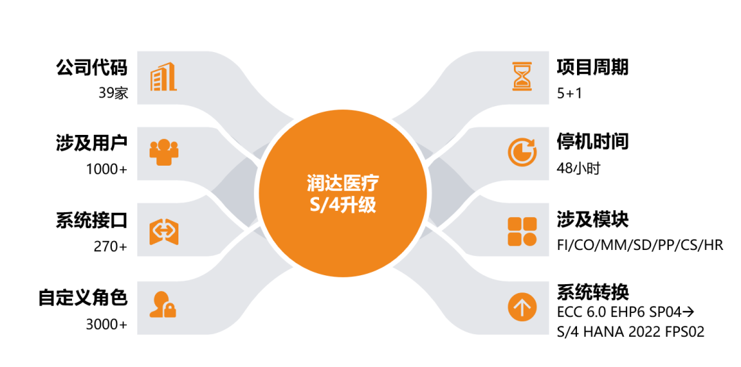 此次润达医疗SAP S/4HANA升级项目共涉及公司39家,用户1000+人,周边系统接口270+项,自定义角色3000+个,自定义代码检查3000+项,调整500+项,BP转换6.3+W条,财务数据转换9495+W条。