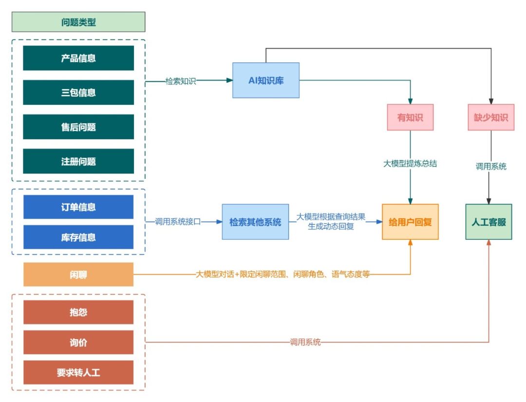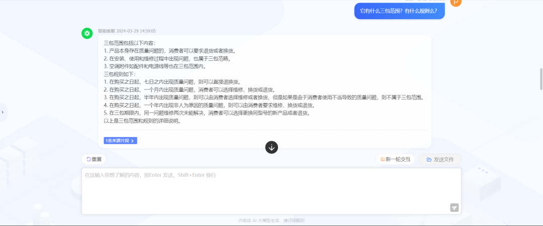 当智能客服察觉到用户的意图是询问产品信息、三包信息、售后问题等相关问题时,智能客服会迅速响应,从知识库中匹配相关信息后,即刻将提炼总结后的答案返回给用户。