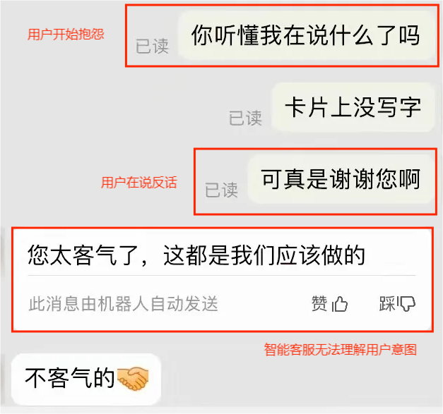 ■ 缺乏情感共鸣:一般智能客服无法感知客户的情感,因此在处理客户抱怨、投诉等带情绪的问题以及在同客户带有感情的交互时,显得力不从心。