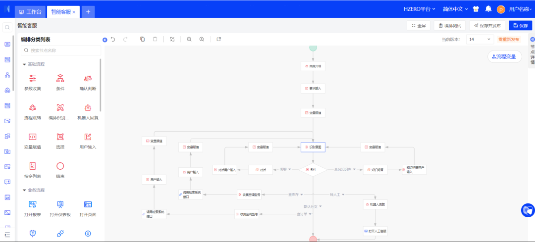 顺利获得“参数收集节点”精准捕捉用户意图信息,随后利用“条件节点”配置条件连线。这些条件连线可映射至不同功能节点,涵盖对话节点、知识问答节点以及调用接口节点,确保用户意图得到精确响应和高效处理。