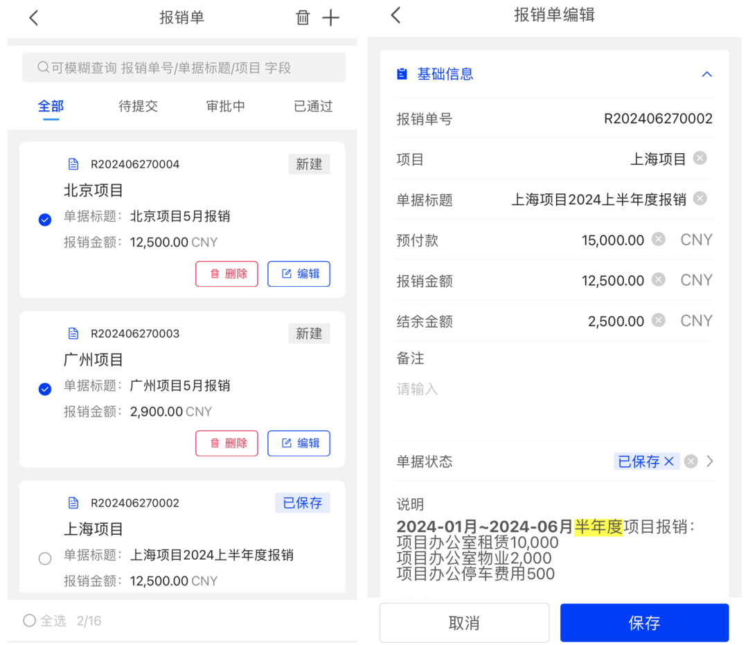 // 场景示例:使用一头多行模板一步生成“财务报销查询-报销单编辑-支出项&收款行”多个页面,开启列表批量选择实现快速选择多行删除并在编辑页面使用富文本组件显示标注重点格式的说明信息。