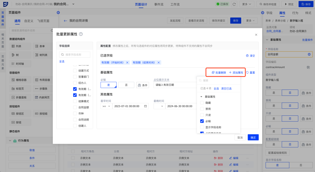 // 场景示例:合同的有效日期,其起始和结束都为合同不可或缺的信息,且需对最早与最晚时间范围予以限制。用户可以顺利获得批量属性配置同时选择这两个字段,并选择相应的属性配置即可。