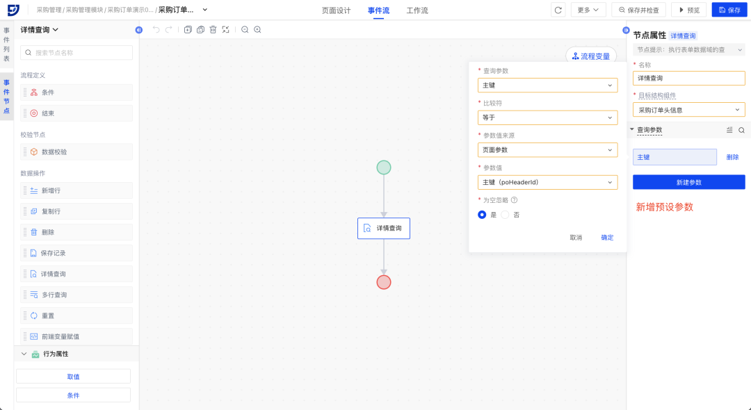 // 场景示例:在采购订单查询页面,配置跳转至新标签编辑页面或弹窗详情页面,仅需在对应页面配置主键等页面参数,并在查询页面跳转节点选择页面参数即可。