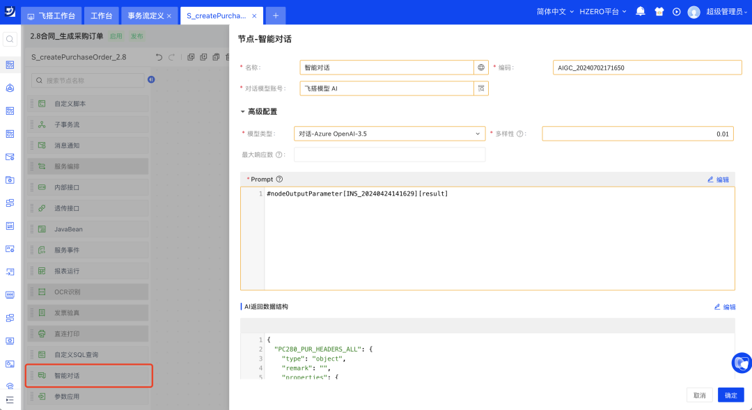 飞搭逐步融合AIGC能力,事务处理流新增智能对话节点,支持调用AI接口处理数据取得返回结果;脚本事件新增智能对话函数,支持调用AI接口处理数据取得返回结果。
