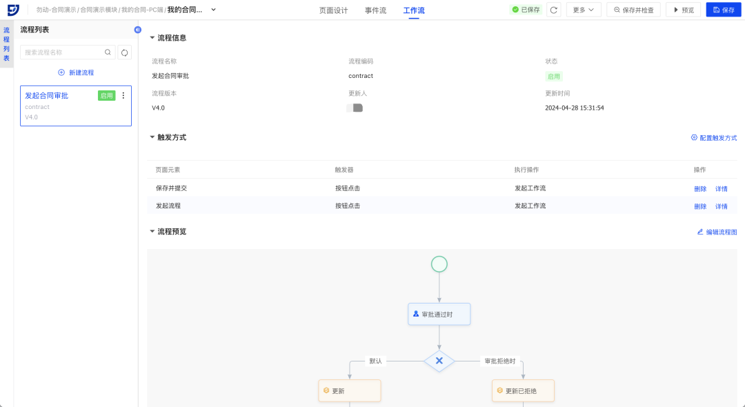 // 场景示例:合同信息需要经过业务审批,用户能够在飞搭设计器快速完成合同单据的页面设计以及合同审批工作流的定义,无需前往工作流模块另行配置,极大地提升了配置效率。