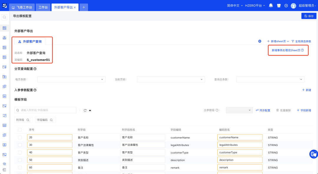 // 场景示例:客户数据需顺利获得外部接口查询获取后再导出,用户可先配置事务处理流调用外部接口取得客户数据,再基于此事务处理流创建为导出模板。