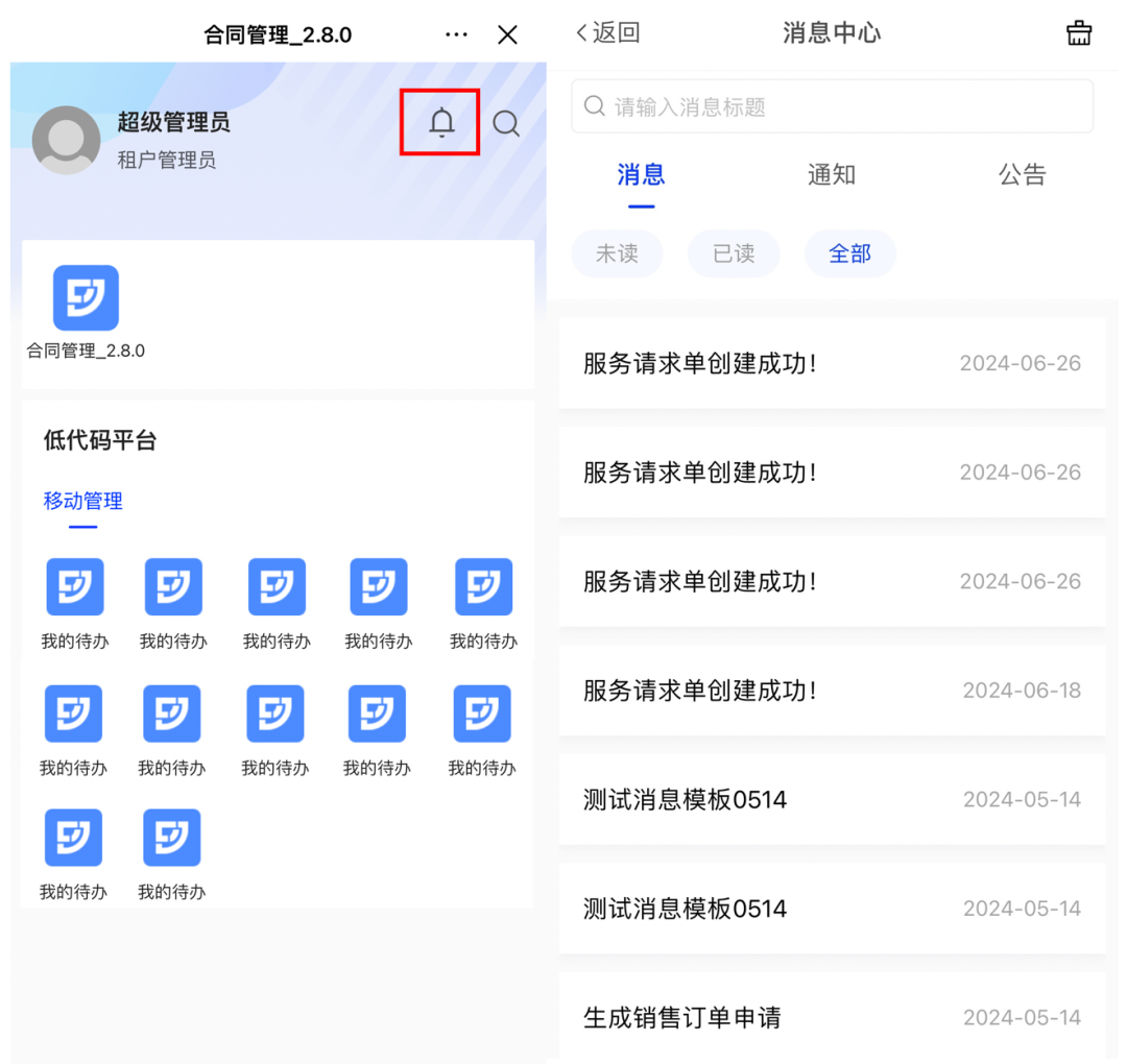 为实现用户可在移动办公时,随时查看业务消息,飞搭移动应用新增消息中心,可查看系统消息通知和公告。