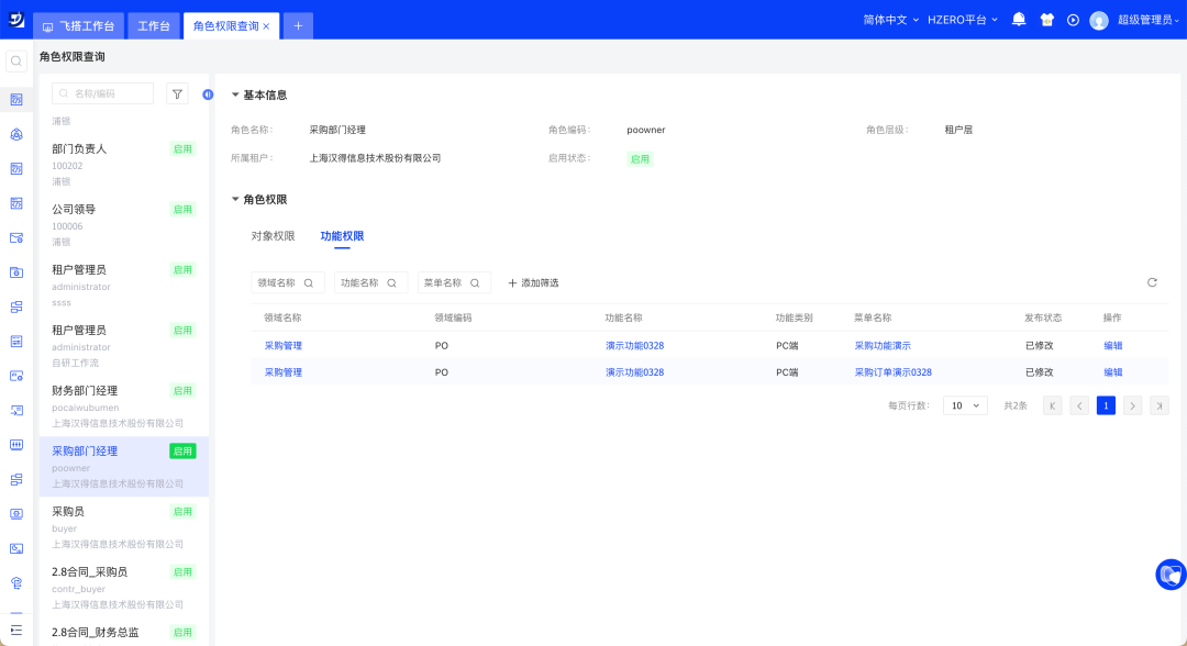 // 场景示例:用户查询采购部门经理角色所有的功能及对象权限,可访问【角色权限查询】功能,选择采购部门经理角色,查看该角色的权限。