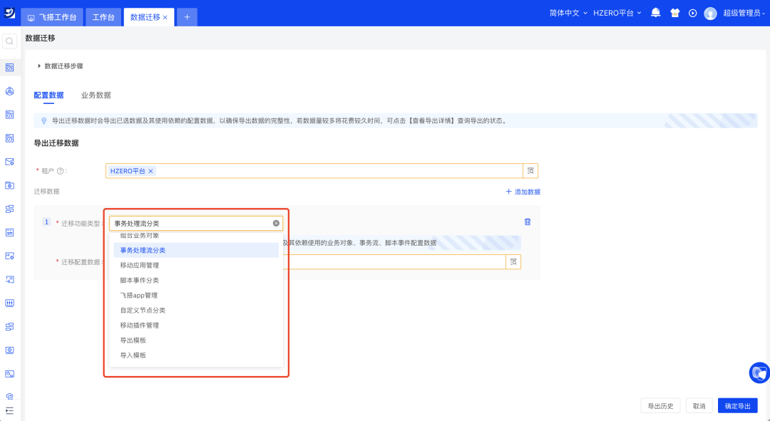 为帮助用户更快速在不同环境之间更新数据,飞搭数据迁移功能支持更多维度的配置数据迁移;