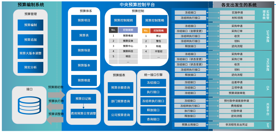 中央预算控制平台就像企业预算的中央银行,各业务系统提请流程就像在POS机上“刷卡”,能被实时检测到余额够不够。