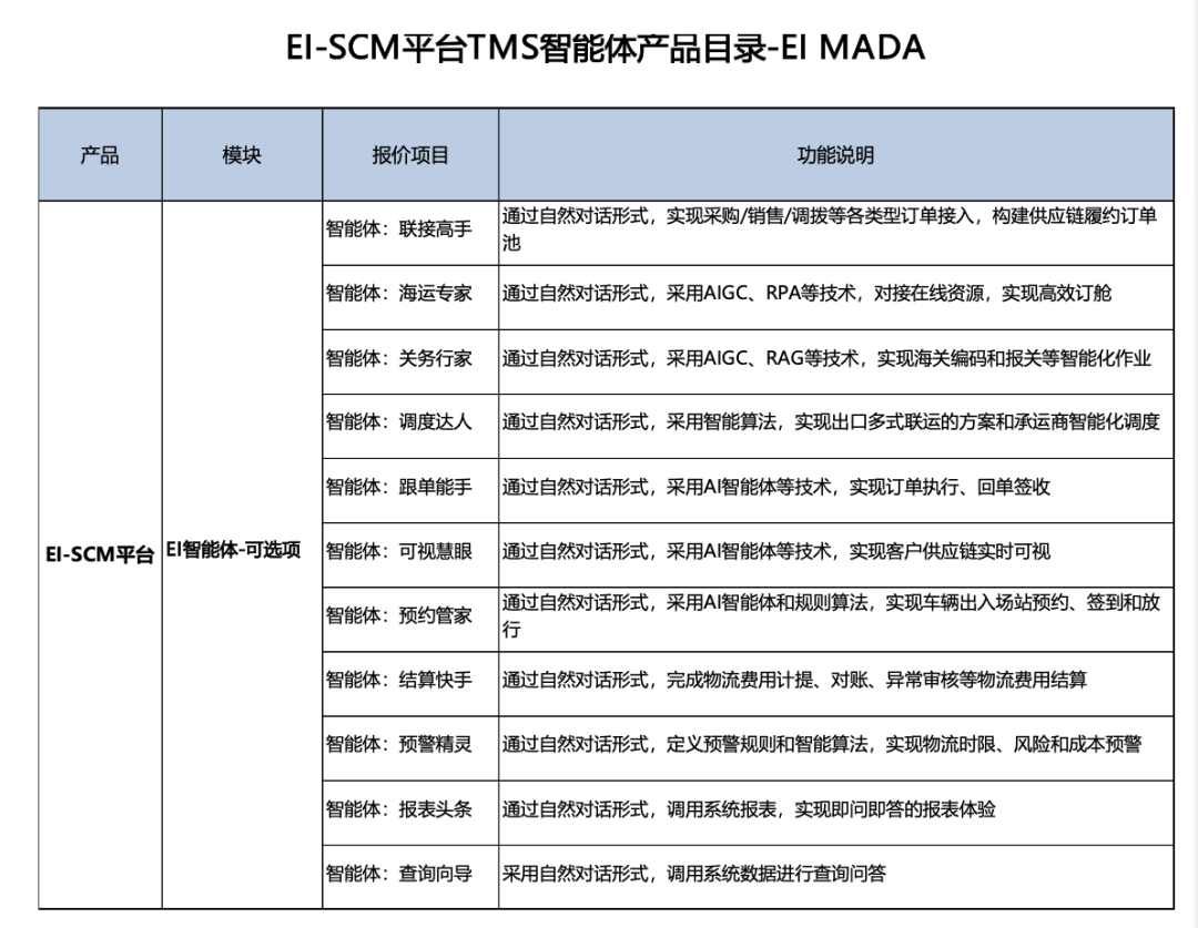 为充分发挥大模型和智能体的应用价值,亿砹对 EI-SCM 平台进行了全面升级,实现全场景智能化。其中仅 E-TMS 产品就给予以下标准智能体产品服务: