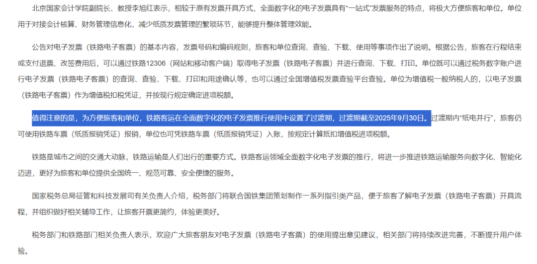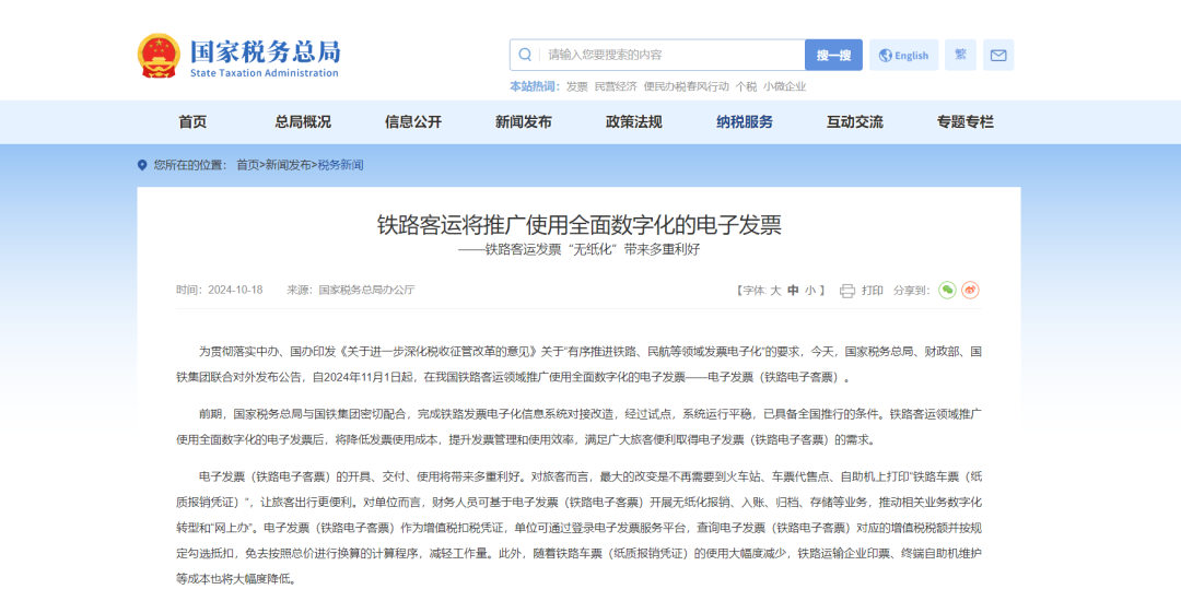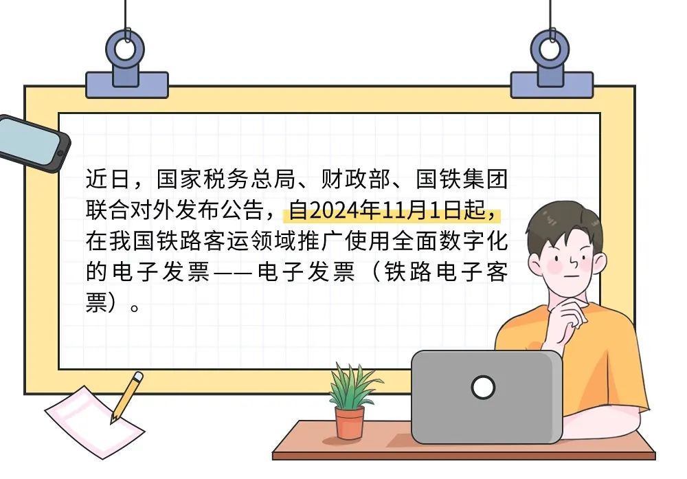 10月18日,税务总局、财政部、中国国家铁路集团有限公司,三部门联合发布一则重磅消息:2024年11月1日起,铁路客运推广使用全面数字化的电子发票。
