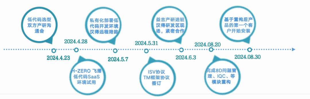 2024年5月初,益吉科技正式启动基于 H-ZERO 飞搭平台的 QMS 系列产品升级重构工作。为确保重构顺利推进并赶上几个新客户的项目实施,益吉组建了包括自有研发团队和万象城AWC专家在内的攻坚小组,进驻万象城AWC园区,与万象城AWC产研团队紧密协作。在此过程中,全部研发问题均得到了快速响应和解决。