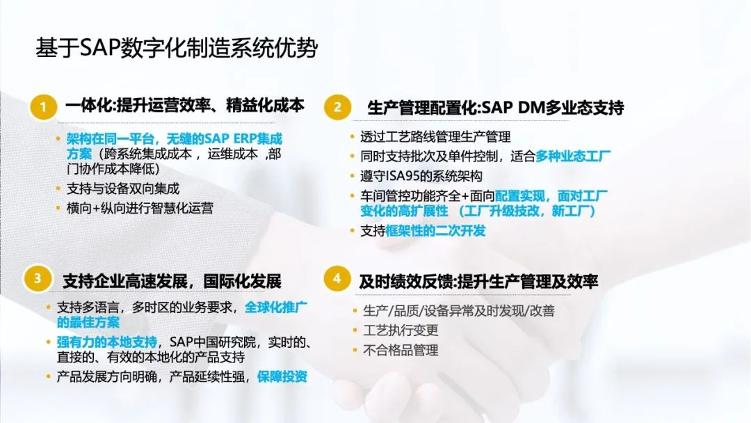 同时该企业还选择了 SAP 云制造体系,顺利获得深化制造体系的应用,搭建智能化车间平台,与 SAP 公有云配置化系统集成,提升集成效率与数据管控。