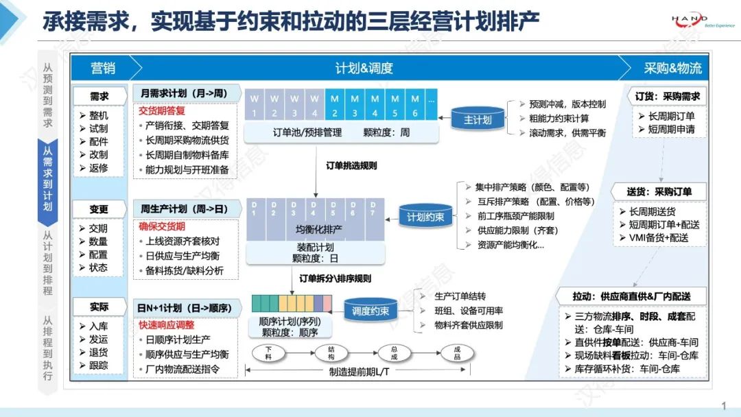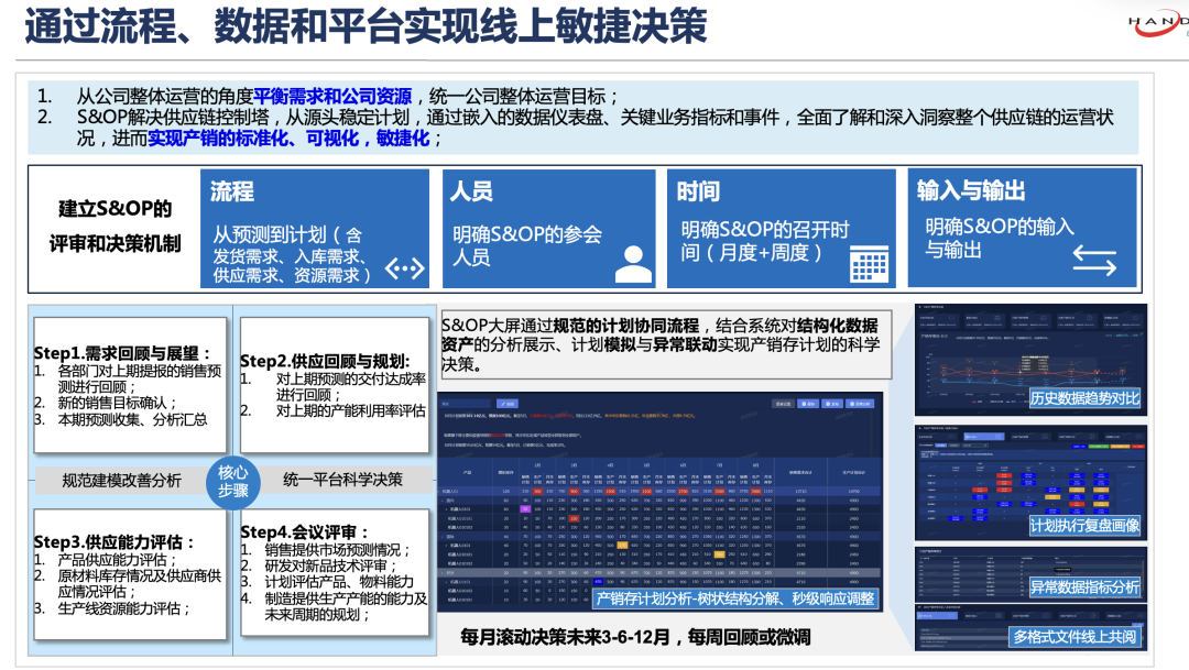 「点击图片分析更多」 欢迎来到「数字劲动力,智造塑未来」万象城AWC智造访谈第七期。今天我们邀请到的嘉宾是来自智能制造事业部供应链交付中心的高级经理何霆。 本期我们将会与大家一起聊聊关于企业如何克服供应链计划的挑战,构建高效的计划协同体系! 近些年众多制造企业都在逐步建设APS、S&OP等供应链计划相关的应用系统支撑,且随着后疫情时代制造业趋向于C2M模式的开展,消费者个性化需求崛起与主权意识增强,促使企业需从传统标准化生产转向定制化。 这些依靠传统的ERP标准作业方式,已经难以支撑企业高速开展及精益化管理的诉求;同时伴随着AI等智能技术的崛起,也正在为企业供应链计划给予技术支撑。 01 供应链计划协同的困难 主持人:从您的观察来看,企业现在在供应链计划方面有哪些痛难点? 何霆:我理解核心是两个点:协同和决策。第一就是协同困难,当前企业所面临的问题是销售接到订单之后无法准确回复交期及生产进度,这样会导致频繁的电话或者线下沟通。同时,销售也不清楚现在工厂或采购相关的瓶颈在什么地方,就没法去引导客户和做未来的预测。这主要是缺乏有效的信息协同,进而引发了供应链层面的牛鞭效应,其实导致各环节的抱怨会比较多。 第二就是决策困难,比如我们现在接触的很多集团化客户,都是多基地生产的方式。销售在接到订单之后,其实是难以决定分配到哪个具体的生产基地的,需要平衡交期、生产效率、包括成本等因素。这一难题其实在车间的均衡化排程里也会存在。 主持人:关于您刚刚提到的第一个难点协同,您觉得站在企业的角度最应该关注的是哪部分呢? 何霆:我理解企业的核心还是以客户为中心,所以企业最关注的应该还是产销协同。但产销协同它并不只是销售和生产两个部门。“销”代表的是销售、服务和发运;“产”代表产供研,生产、采购供应和研发。这两个字就代表了现在企业里从产品开发到市场销售整个全价值链的关键环节。 主持人:我分析了。结合我们的客户案例,是否有更为完整、具体的协同方面的建议呢? 何霆:在我们整体的解决方案里面,我们通常会叫产供销协同。在这个层面上我们一般会顺利获得三个点来讲。 第一个就是产销协同,即销售和生产之间的协同。我们会把销售订单接到之后,怎么样去给到生产,中间还需要把订单承诺这一因素考虑进去,而订单承诺也是蛮复杂的,他对业务流程和数据要求比较高。 第二点其实就是我们说的产产协同,就是生产计划内部的协同。我们会把它分成企业的三层计划体系,比如我们说的要树立月维度的中长期计划、周维度的装配计划和日维度的顺序计划。基于这样的三层计划做相关的协同,同时也要关注总装和部装跟单的追溯。 第三点是产供协同,就是生产和供应之间的关系。我们会基于前面提到的三层计划体系去拉动我们供应计划,比如说月维度的一个中长期计划拉动采购的订货计划,周维度的装配计划驱动采购的送货计划,包括日维度的顺序计划驱动场内物流的配送计划。 主持人:我们常说的以客户为中心、提高客户的满意度,如果客户能获取到一个相对准确的预计交期,的确也是对我们提高客户的满意度有所帮助的。除了订单交期准确,还有哪些因素可能会影响到客户的满意度呢? 何霆:这个问题其实挺大的,因为我们有些客户的口号就是QCDD number one,Quality(质量)、Cost(成本)、Deliver(交付)、Design(设计),前三个其实是企业的立根之本、硬性指标;第三个是提高整个订单的交付周期,其实这也是很多客户期望顺利获得产销协同去解决的,就是缩短整个订单的交付周期。 大部分客户会抱怨销售接了订单生产做不了,这也导致了我们前面说的订单承诺比较困难、不准。这类的问题我们总结就是统一预期、双向倒逼。顺利获得产销的双向考核,营销基于生产单位给予的产能型谱,按照产能型谱接的订单,生产单位也要能够如期完成,这就是我们说的双向考核。 02 计划决策与可视 主持人:听您前面讲的这么多内容,计划协同确实是一个非常庞大的课题,关联的部门也非常多。前面您刚刚提到两个点:协同和决策,协同方面解答的已经比较清楚了,在决策方面我们一般会有哪些核心的痛难点呢? 何霆:在决策这个方面我们可以用一个案例来展开——产销沟通会。其实现在大部分的客户在组织产销沟通会的时候,都顺利获得Excel、PPT或者说PDF等线下文件做展开,但这种工具展开它其实存在两个问题:第一是领导在会上要求调整的,比如说销售和计划的数量,是没法根据反馈实时模拟分析的;同时判断之后可能会要去做后续的跟踪和待办,但因为这些信息都在线下管理,所以跟踪和待办以及事后的复盘也是比较难去做控制。 针对于上述情况,我们认为企业需要有产销决策平台,以支撑在会上的实时调整和模拟,并能够支撑对会后的待办的跟踪和闭环的追溯。 主持人:这个过程的确就是数字化让决策去加速,充分地使用了业务数据,让数据在平台中发挥最大的价值。在决策方面,最近市面上有一些比较火的智能工具,我们是否也有尝试去进行融合呢? 何霆:这个其实也是有的。以我们的一个行业头部客户为例,前面我们也提到过,他们是集团化的多组织生产模式,多基地的。在销售接到一个订单之后,他需要基于我们前面说的QCDD分配规则,考虑成本、交期、质