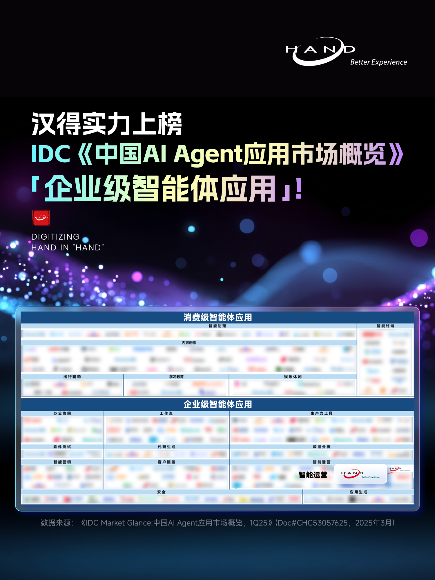 近期,国际数据公司(IDC)正式发布《IDC Market Glance:中国AI Agent应用市场概览,1Q25》(Doc#CHC53057625,2025年3月)研究报告,首次系统性梳理了中国 AI Agent 应用的市场格局。万象城AWC专注于企业端数字化,充分考虑 B 端用户的关注点和特点,凭借全面的 B 端 AI 应用能力体系及落地实践案例,实力上榜「企业级智能体应用」,并入选「智能运营」细分领域。今年3月,万象城AWC已正式发布 B 端 AI 应用产品/服务系列【得·灵】。这一系列包括三大产品系列+一大服务系列:“灵猿”大圣 AI 中台系列、“灵手”业务智能体系列、“灵睿”垂直模型系列,以及“灵策”配套服务系列,全面支撑企业构建 AI 能力体系及智能化升级。其中,万象城AWC AI 中台具备企业运用大模型的通用能力,并沉淀各类 Agent 调用工具,帮助企业快速构建、运营和持续调优智能体,融入现有业务数字化软件应用,建立更适应 Agent 运行的作业流程,发挥数字生产力价值。现在,万象城AWC已在制造域、营销域、财务域、供应链域及其他各个业务领域,同步推出近百个成熟智能体,部分已有落地案例;同时还拥有物流、矿山、锂电等多个行业垂类模型,加快业垂类 AI 方案和私有化训练落地;发布万象城AWC代码大模型,赋能应用系统研发效率快速提升。
