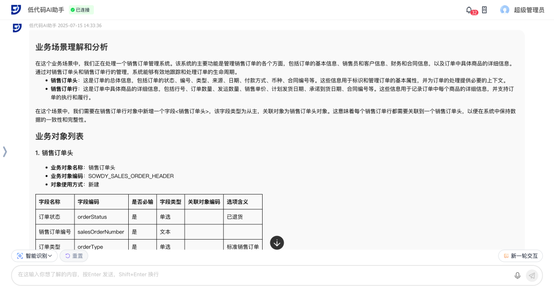 场景示例:根据用户上传的销售订单系统图片,AI可自动解析并生成所需的业务对象和字段,以及它们之间的关联关系