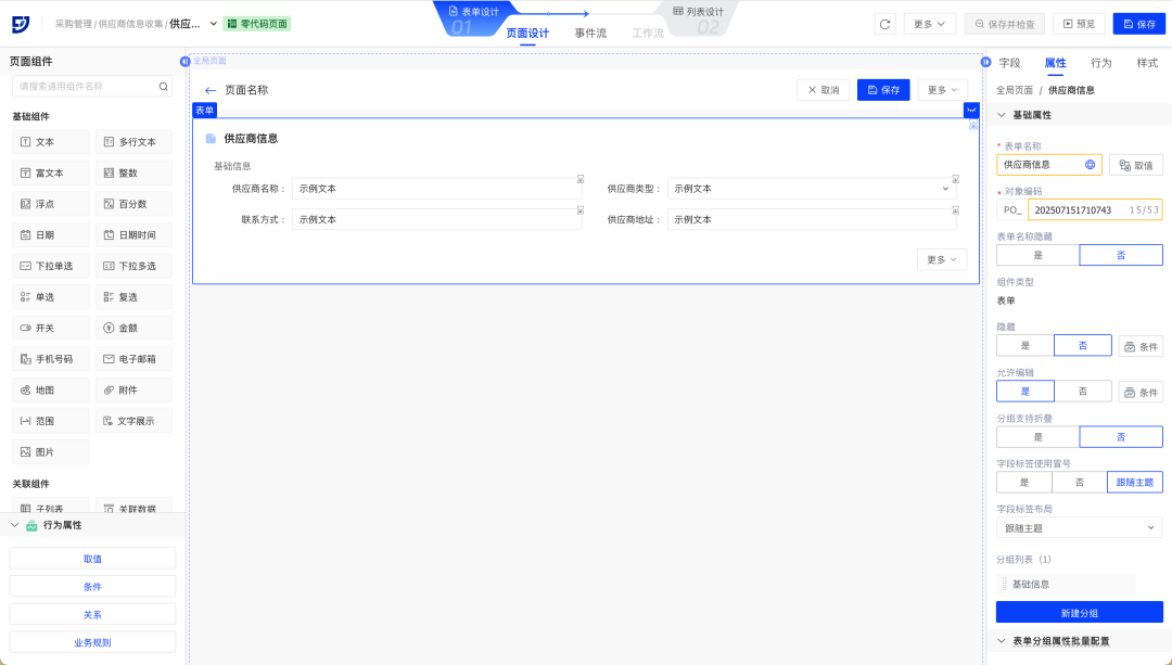 场景示例:顺利获得简单表单快速收集供应商信息,可创建零代码页面,并在页面中拖入供应商信息相关字段