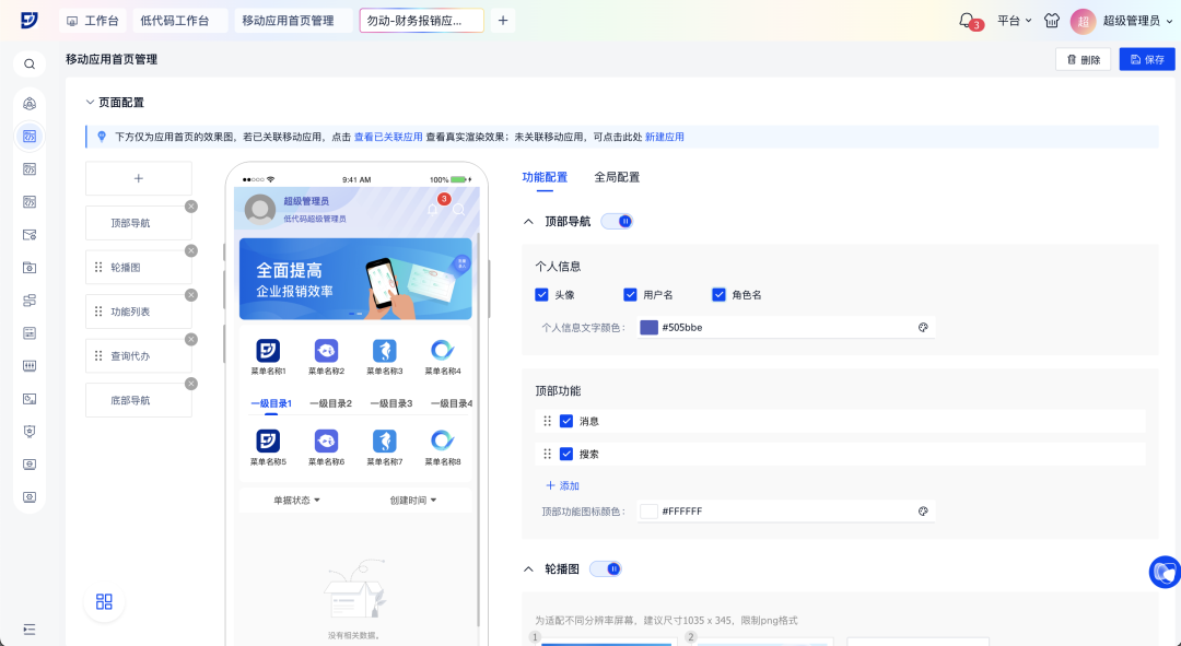 场景示例:财务报销移动应用自由配置报销提示、功能列表及常用单据入口,突出核心业务模块,满足不同业务需求,提升工作效率