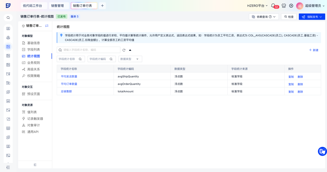全新推出字段统计功能,支持对业务对象字段的值进行求和、平均值等汇总统计操作,帮助用户高效评估业务表现、优化决策流程