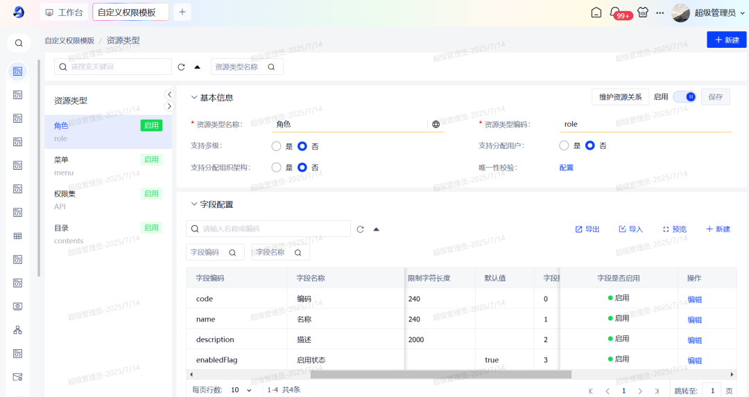 支持创建多套自定义权限模版,动态配置资源类型、资源字段以及资源之间的关联关系。