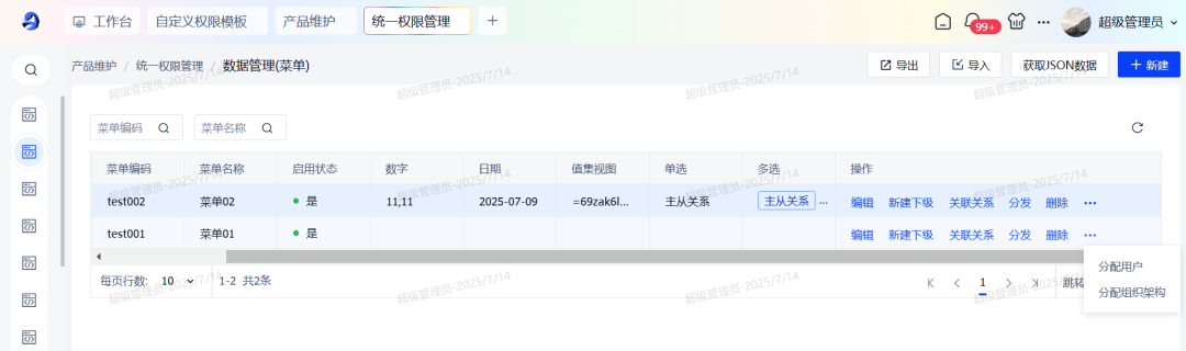 产品使用自定义权限模版后,可在配置好的资源类型下维护资源数据,资源数据间的关联关系,以及跟用户/组织架构的分配关系。