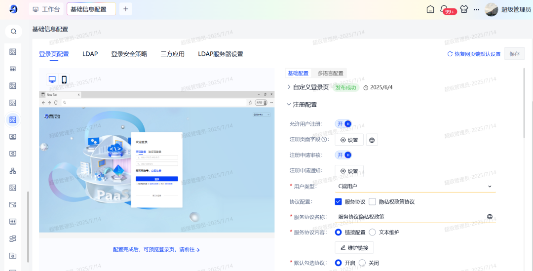 给予管理员配置页面,对注册入口是否开启、注册页面字段显示、注册是否审批、注册结果是否通知等功能进行动态化配置。