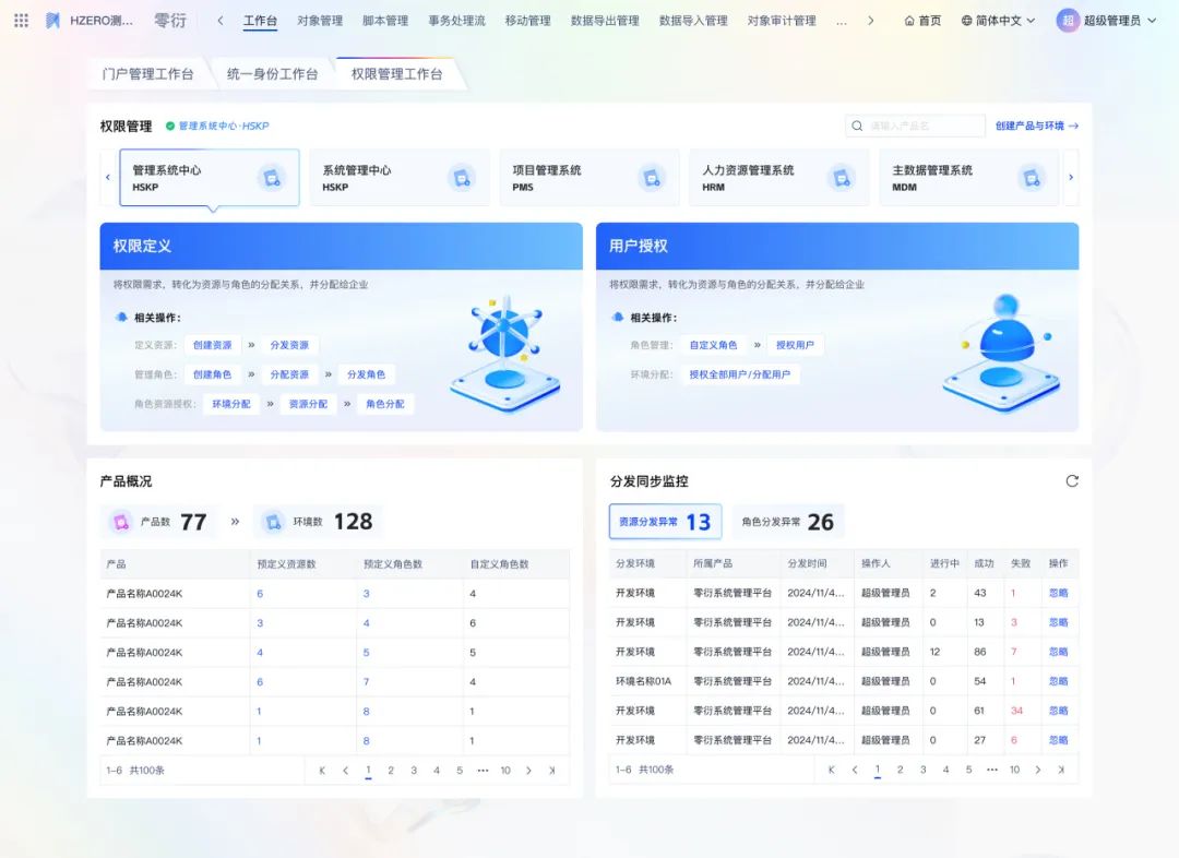 给予产品系统管理入口,支持管理员快速进行权限定义、用户授权等操作,统计分析产品系统数量以及分发监控等数据。