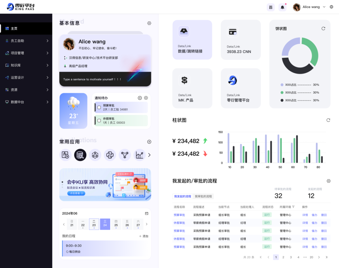 预置多套不同业务场景的工作台,动态进行数据的汇总与报表展示,方便管理员决策分析