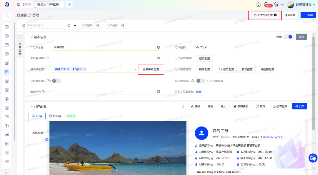 给予全局多语言默认值配置,同时支持对单个门户和所有组件字段进行多语言维护。
