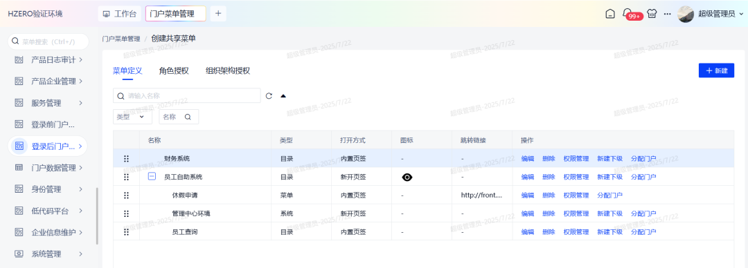 支持创建共享菜单并授权权限管理和分配门户