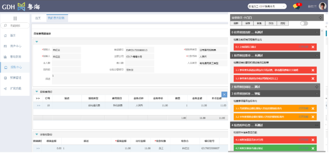 智能审单助手在用户提交单据时进行自动预检并提示;同时对于需要转人工处理的单据,在财务共享审核界面以清单式审核要点的形式呈现,提高审核效率和准确度