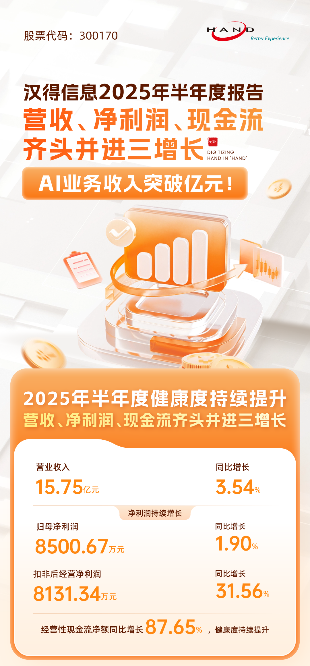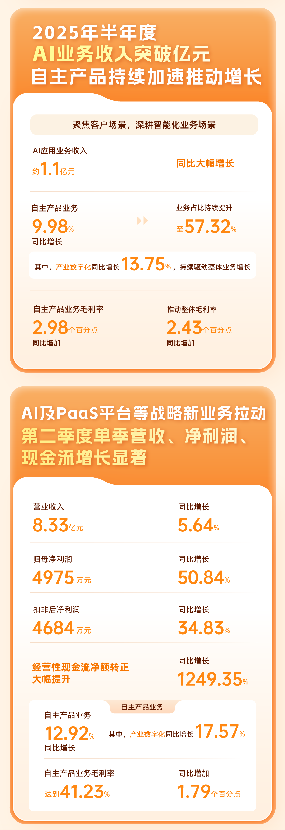 营收、净利润、现金流齐头并进三增长,AI业务收入突破亿元,自主产品持续加速有助于增长,AI及PaaS平台等战略新业务拉动第二季度单季营收、净利润、现金流增长显著