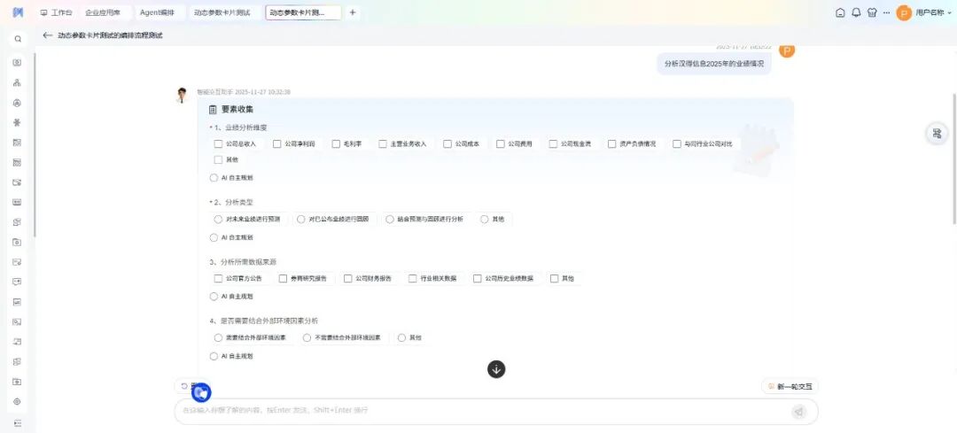 能够在用户提出初步问题后,使Agent主动追问细节来精准把握用户需求,并即时将抽象需求转化为可视化的选项卡片,用户无需手动输入,轻松一点即可完成信息补充。