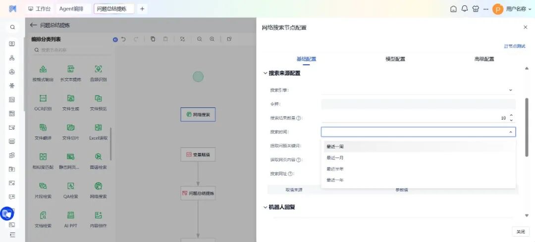 在利用网络搜索节点获取信息时,可以添加时间范围等过滤条件,提高搜索结果的时效性和相关性