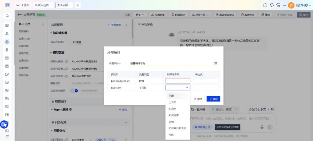 企业知识助手的前置编排功能重新定义了传统的问答方式,让知识获取更加智能、高效。它能够结合上下文对用户原始问题进行优化,将模糊诉求转化为更明确的提问。同时,前置编排还支持引入外部知识库,进一步拓展可检索的知识范围。在编排执行完成后,系统也可依据流程的输出结果动态选择最合适的知识资源,使答案生成更精准、更贴合用户需求。