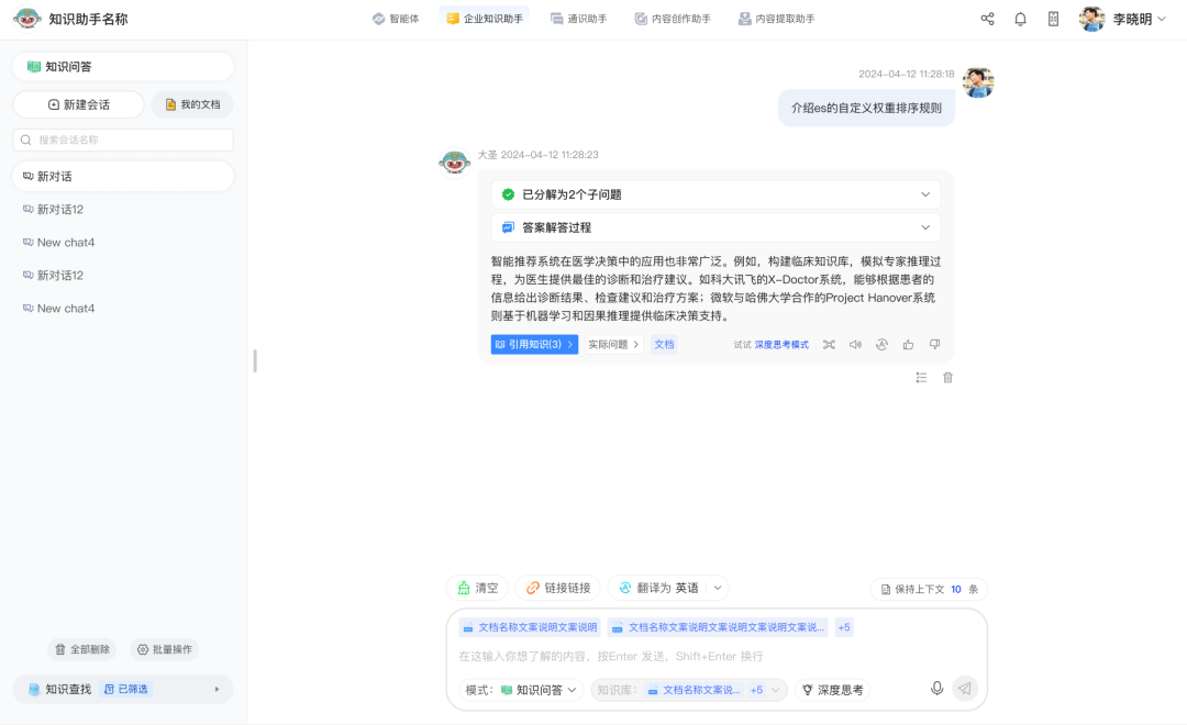 多会话管理功能为用户给予并行问答能力,每个会话都保持自己完整的历史记录和上下文语境,帮助用户随时回溯答案。用户可以在多个会话之间自如切换,处理不同业务问题,也无需重复描述问题。同时,会话也支持重命名、删除等操作这种多会话功能避免了不同话题间的思路混淆,大大提升知识探讨的深度和广度。