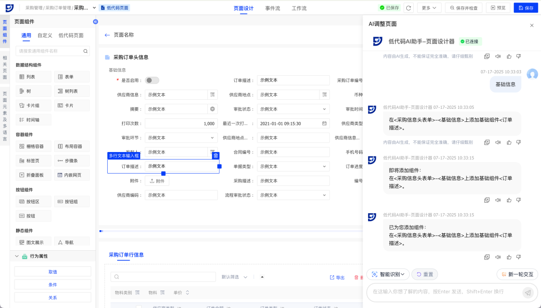 场景示例:采购订单页面维护人员,在采购订单表单中快速新建订单描述、订单进度等字段