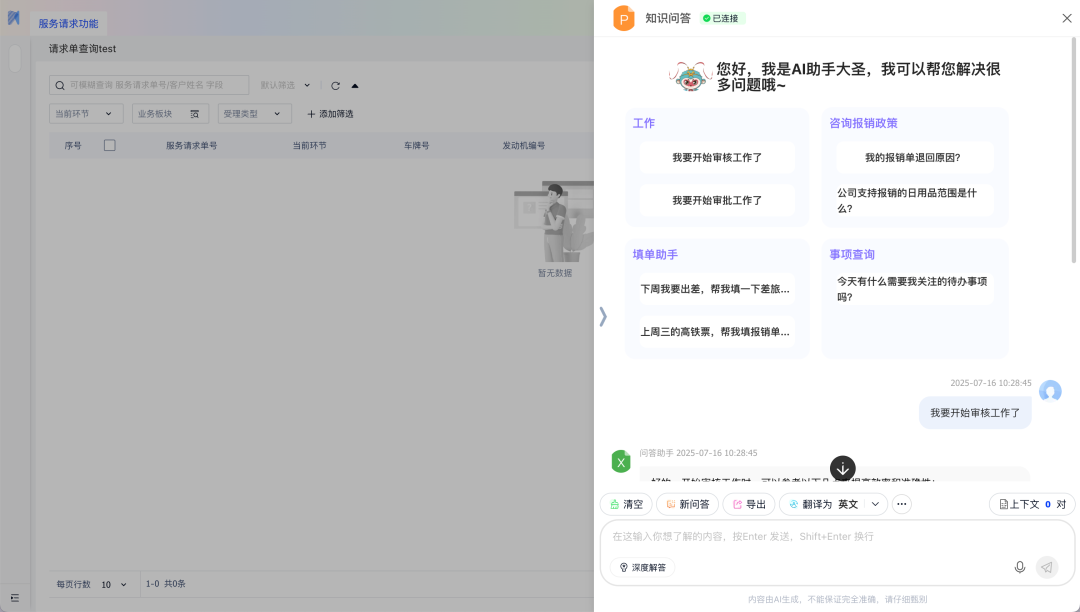 场景示例:在请求单查询页面,打开AI对话框,取得审批流程建议等相关帮助