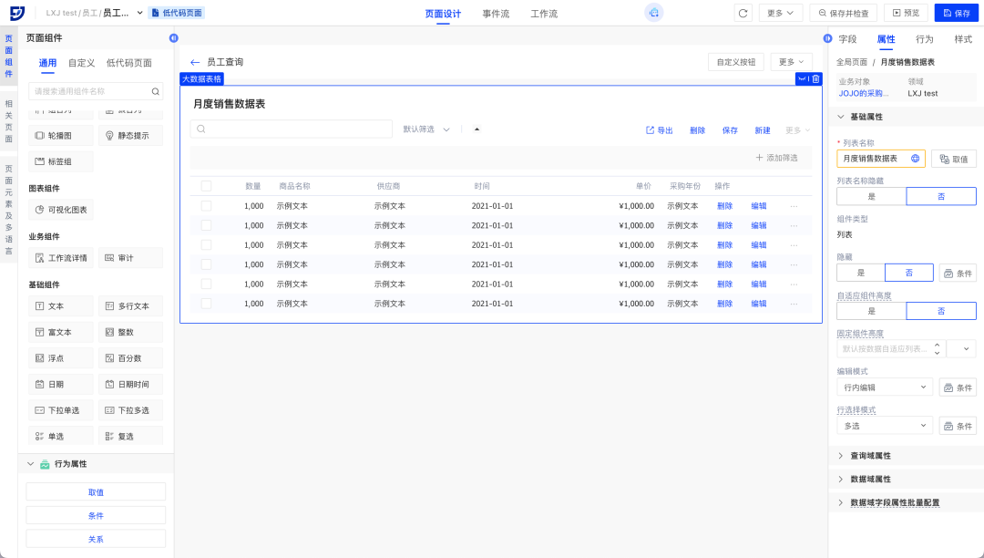 · 布局灵活:列表数据域支持折叠字段/导航栏布局可灵活调整/多区域支持拖入卡片组