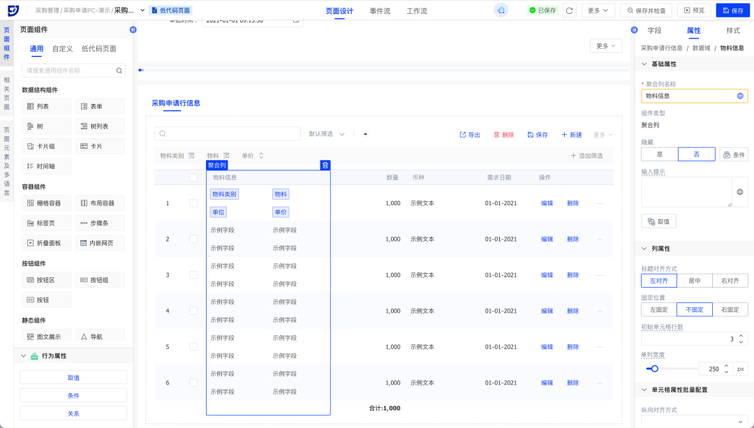 场景示例:在采购申请行列表中,将物料相关的信息(物料类别、物料名称、单位、单价)显示在同一列,并统计总价数据