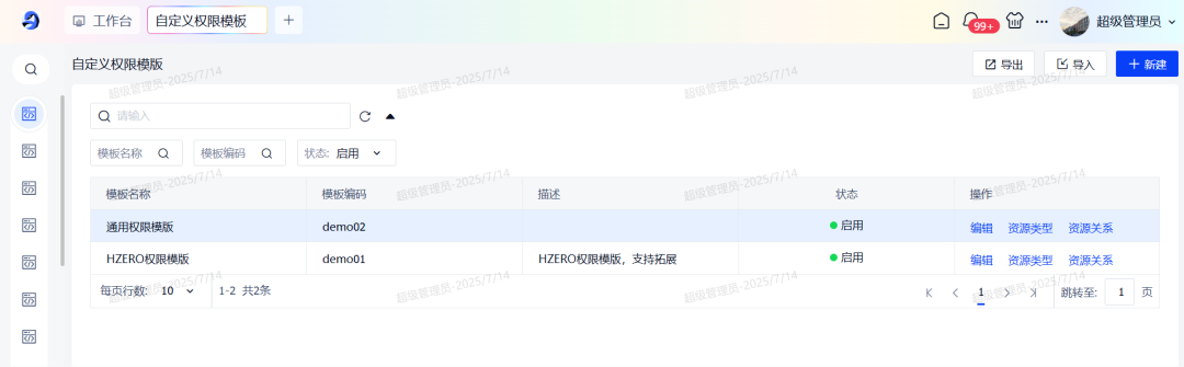 支持创建多套自定义权限模版,动态配置资源类型、资源字段以及资源之间的关联关系。