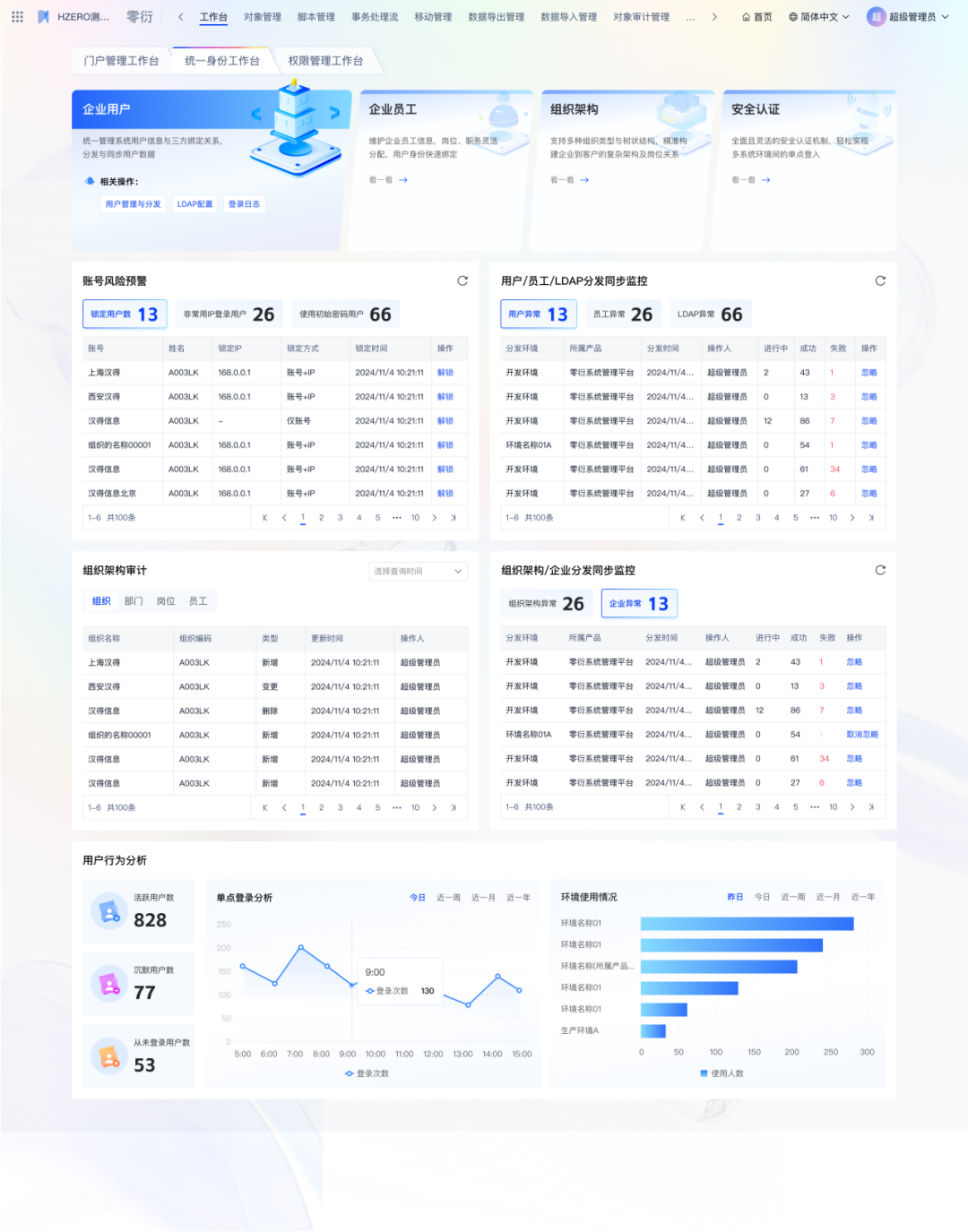 给予组织架构和安全认证相关功能的快速入口,统计风险账号、用户行为分析、数据分发监控等报表,全面提高系统安全性。