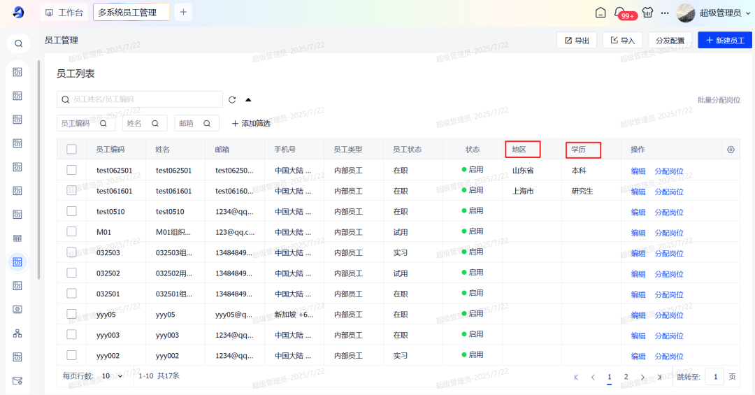 用户表、组织/部门/岗位表、职务表均增加个性化可拓展字段。用户可根据实际需求添加字段,同时支持个性化字段的分发和导入导出。