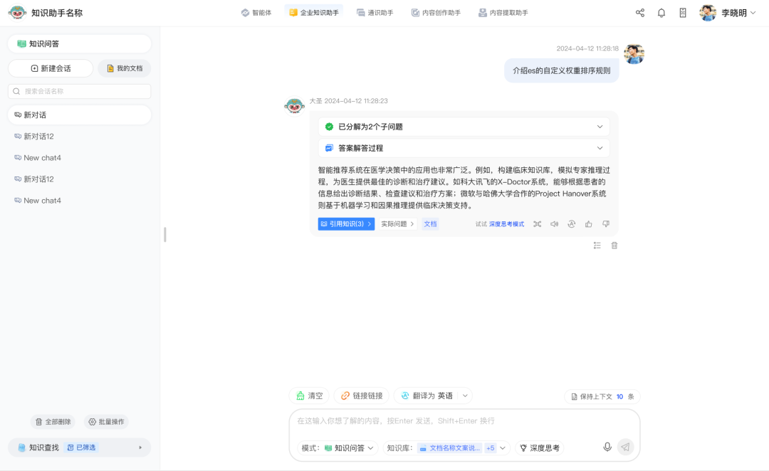 多会话管理功能为用户给予并行问答能力,每个会话都保持自己完整的历史记录和上下文语境,帮助用户随时回溯答案。用户可以在多个会话之间自如切换,处理不同业务问题,也无需重复描述问题。同时,会话也支持重命名、删除等操作这种多会话功能避免了不同话题间的思路混淆,大大提升知识探讨的深度和广度。