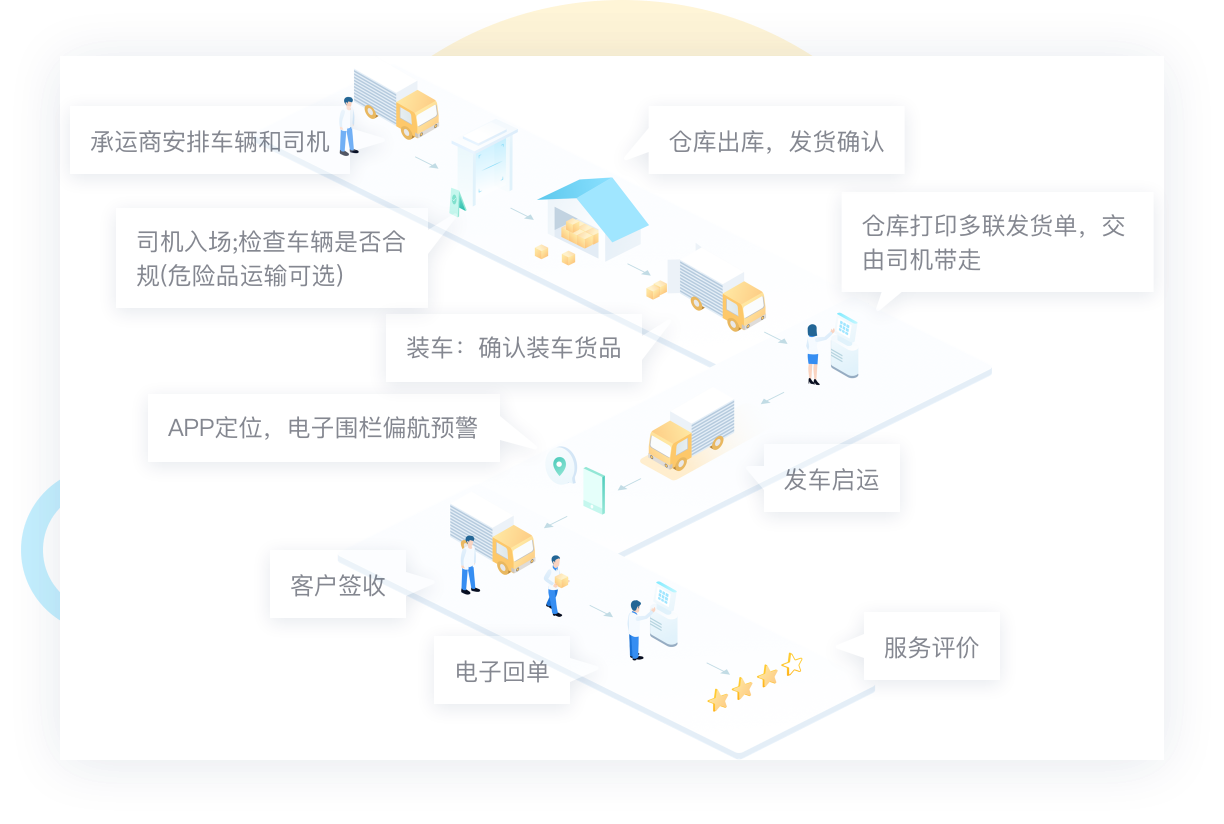 物流管理节点可配置,实现不同物流场景自动监控、可视化,做到事前预警,保障货物安全交付;邮件、短信、微信、APP等多手段实现高效作业协同,保障及时准确处理;对接国家及行业车辆监控科技平台,智能监控车辆在途异常,减少人为反复沟通;监控仓库卸货效率,减少押车/等待时间,均衡到货