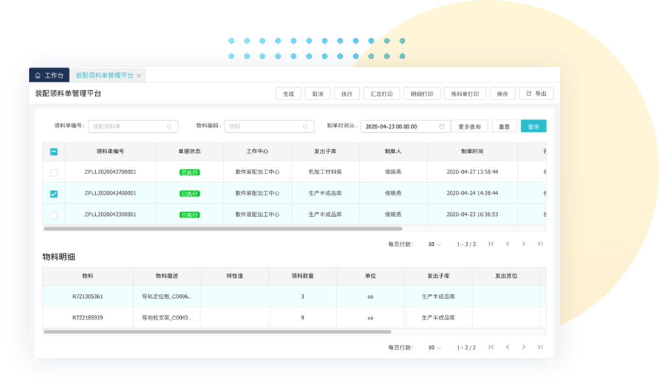 包括仓储事务管理,同时对物料现状进行管控分析,条码管理让行为实现可追溯。